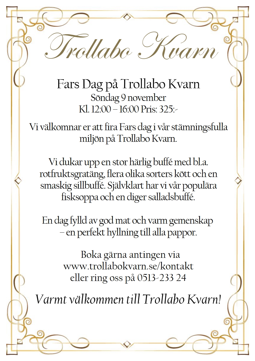 Vi välkomnar er att fira Fars dag i vår stämningsfulla miljön på Trollabo Kvarn.